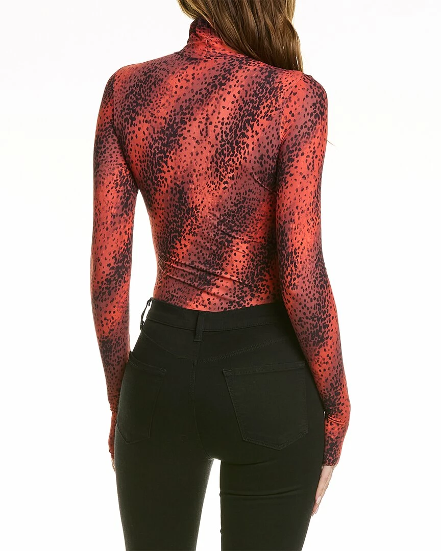 - Classic Turtleneck Bodysuit In Red Animal Print With Seamless Design