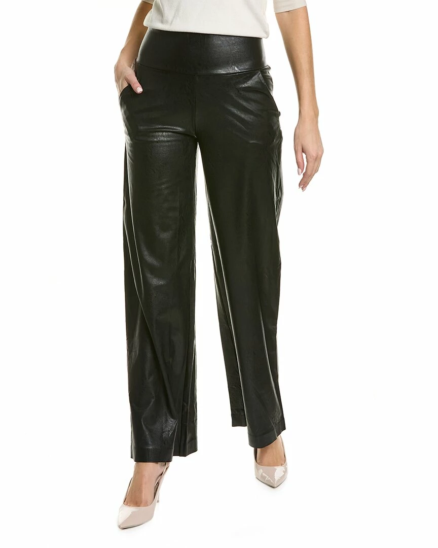 - Wide Leg Legging In Black With Faux Leather Design, Wide Waistband, And Two Front Pockets