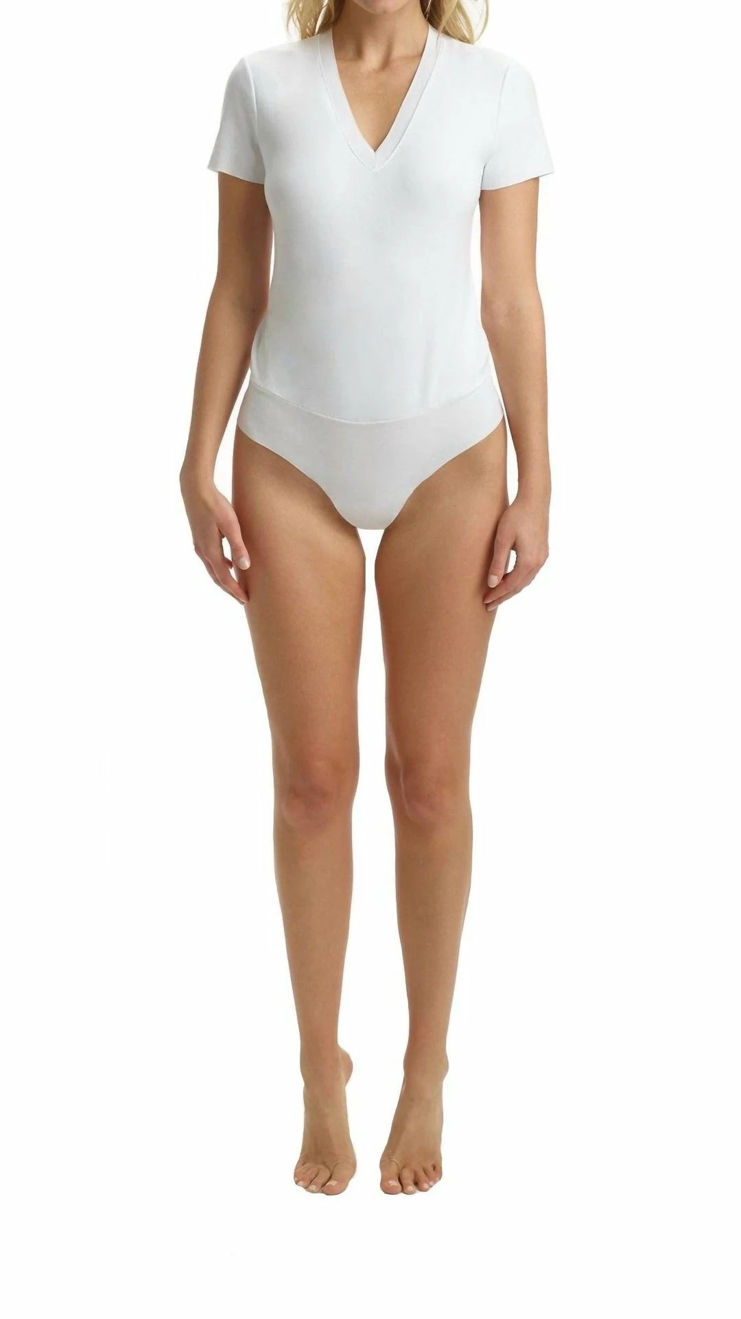 Seamless construction.V-neckline.Short sleeves.Cheeky rear coverage.