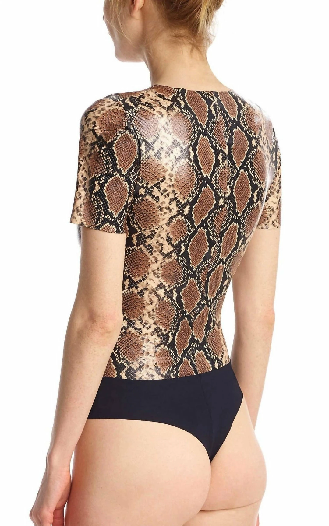 Made in the USA of imported fabricsFaux leather body (55% polyurethane, 44% viscose, 1% elastane) bottom (78% nylon, 22% spandex), gusset (86% cotton, 14% lycra)Four-way stretch faux leatherSmoothing PropertiesSignature raw-cut thong bottomSnap closure at bottomUSA constructedYour favorite animal print in our four-way stretch faux leather. Paired with our signature raw-cut thong bottom for a smoothing, sleek, on-trend look.