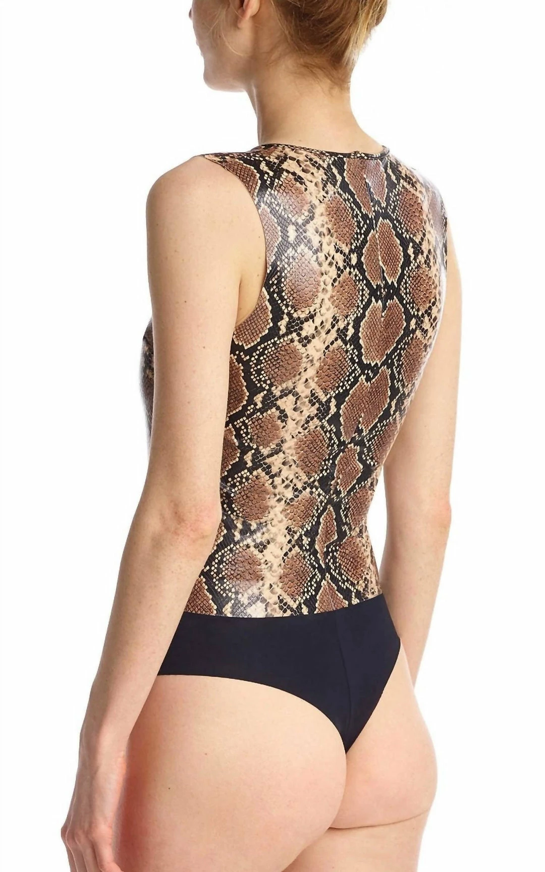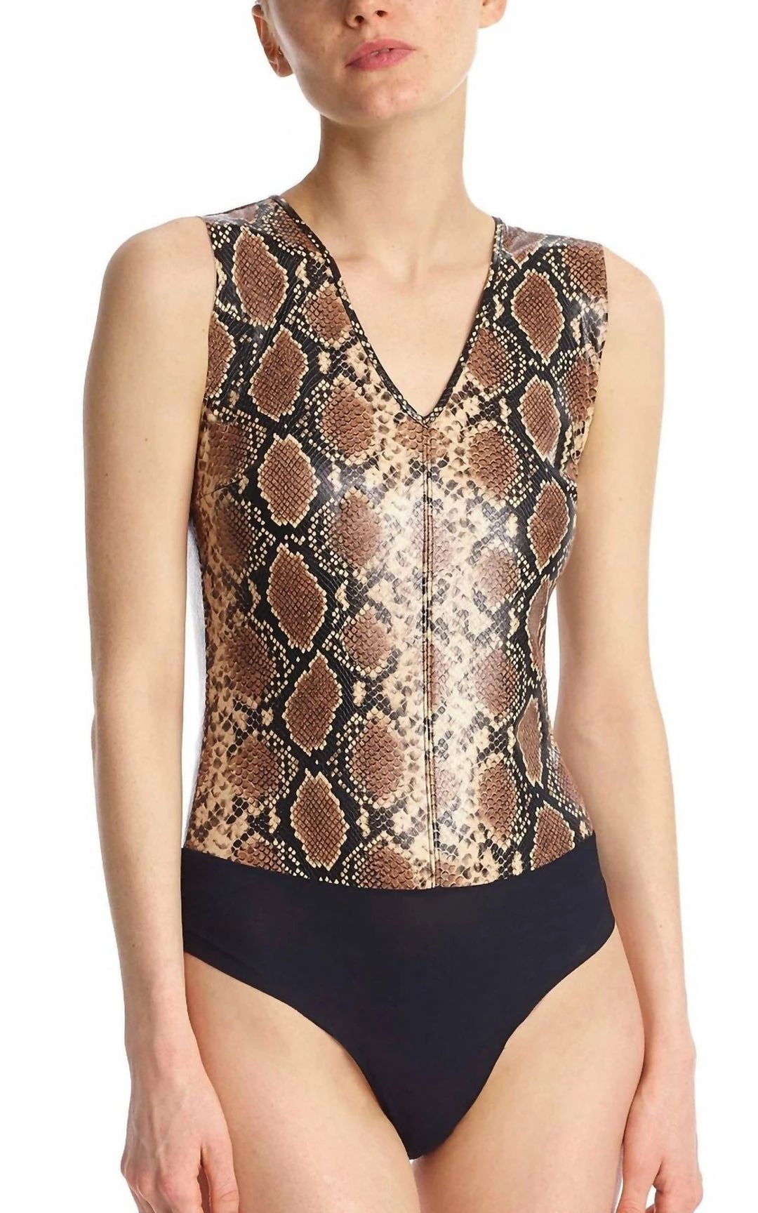 Faux leather bodyFour-way stretch faux leatherSmoothing PropertiesSignature raw-cut thong bottomSnap closure at bottom